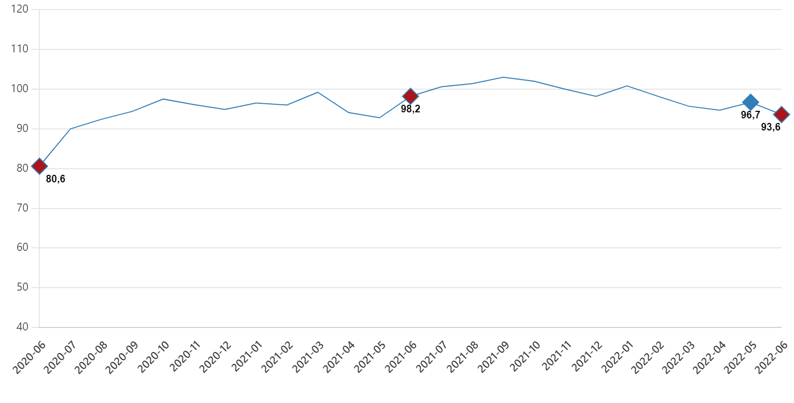 Bir önceki aya göre haziran ayında tüketici güven endeksi yüzde 6,2 oranında azalarak 63,4 değerini, reel kesim (imalat sanayi) güven endeksi yüzde 2,2 oranında azalarak 104,6 değerini, hizmet sektörü güven endeksi yüzde 1,7 oranında azalarak 119,6 değerini, perakende ticaret sektörü güven endeksi yüzde 2,3 oranında azalarak 118,7 değerini aldı. İnşaat sektörü güven endeksi yüzde 1,7 oranında artarak 83,0 değerini aldı.