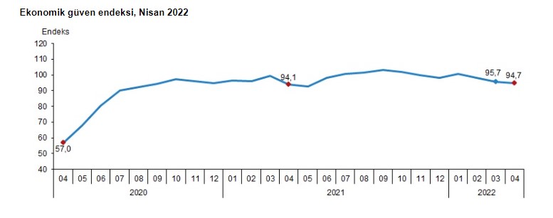 Ekonomik güven endeksi Mart ayında 95,7 iken, Nisan ayında %1,1 oranında azalarak 94,7 değerine düştü. Ekonomik güven endeksindeki düşüş, tüketici ve reel kesim (imalat sanayi) güven endekslerindeki düşüşlerden kaynaklandı.