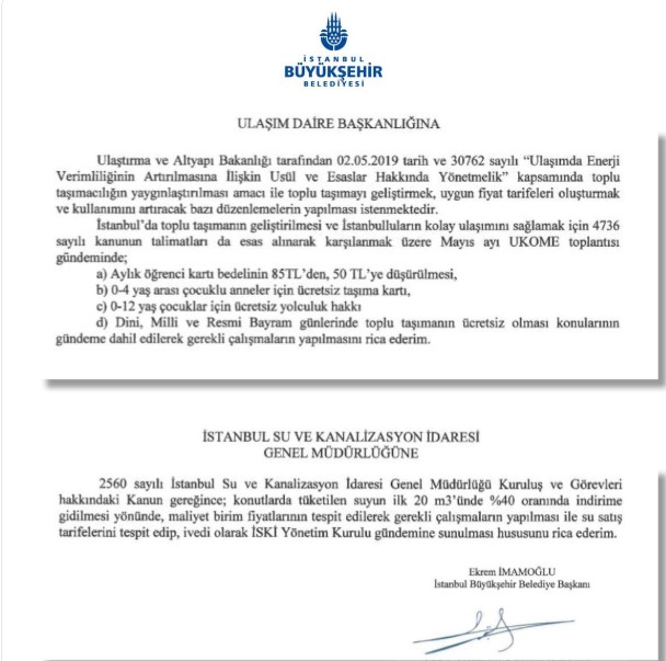 Talimat yazılarını sosyal medyadan paylaşan Ekrem İmamoğlu "Tüm İstanbullu hemşehrilerimizin bilgisine; Söz verdiğimiz gibi, ulaşım ve su fiyatlarında indirim öngören talimatlar İstanbul Büyükşehir Belediyemizin ilgili kurumlarına verilmiştir. Mayıs ayı İBB Meclisi'nde gündeme gelmesini ve onaylanmasını bekliyoruz" dedi.