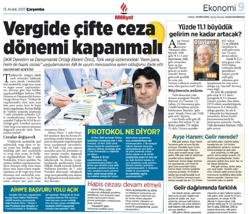 DKR Denetim ve Danışmanlık Kurucu Ortağı Ekrem Öncü’nün Türk vergi sistemine yönelik sözlerine, Milliyet gazetesinin Ekonomi sayfalarında geniş yer verildi.