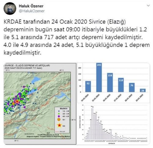 “Kandilli Rasathanesi ve Deprem Araştırma Enstitüsü tarafından 24 Ocak 2020 Sivrice(Elazığ) Depremi’nin bugün saat 09:00 itibariyle büyüklükleri 1.2 ile 5,1 arasında 717 artçı depremi kaydedilmiştir.4,0 ile 4,9 arasında 24 adet, 5,1 büyüklüğünde de bir deprem kaydedilmiştir.”