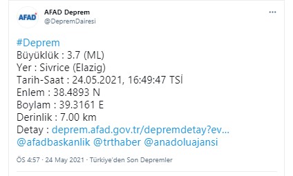 Elazığ'dan son dakika deprem haberi geldi. AFAD Sivrice ilçesinde saat 16.49'da meydana gelen depremin büyüklüğü 3.7 olarak açıkladı. Depremin derinliği 7.00 km. olarak bildirildi. Kandilli Rasathanesi ise depremin büyüklüğünü 3.6 olarak paylaştı.