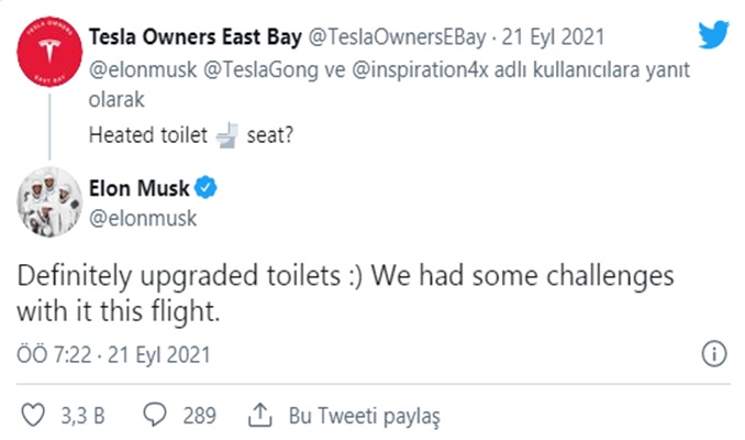 Bir kullanıcının, uçuşta ''ısıtmalı tuvalet'' olup olmadığı sorusuna, Twitter hesabından cevap veren Musk, uzay turistlerinin üç günlük uçuşta tuvalet problemi yaşadıklarını ancak bunun bir sonraki uçuşta düzeltileceğini söyledi.