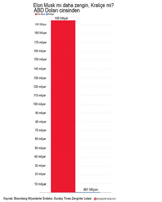 Başka bir şekilde hesaplandığında, Musk'ın net değeri ABD'deki 328 milyon vatandaşın tamamına eşit olarak dağıtılsa kişi başına yaklaşık 600 dolar (yaklaşık 4 bin 500 TL) düşerdi. Bu da koronavirüs pandemisi sırasında ABD hükümetinin dağıttığı teşvikle aynı miktara denk geliyor.