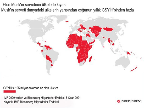 Uluslararası Para Fonu'nun (IMF) rakamlarına göre Musk'ın serveti dünyadaki tüm ülkelerin GSYİH'siyle beraber sıralansaydı, Elon Musk dünyanın en zengin 50. ülkesi olurdu.