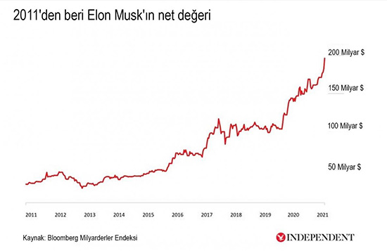 Serveti bir yıldan kısa süre içinde 25 milyar dolardan (yaklaşık 185 milyar TL) neredeyse 200 milyar dolara (yaklaşık 1 trilyon 500 milyar TL) yükselen Elon Musk, Jeff Bezos'u geride bırakarak dünyanın en zengini oldu.