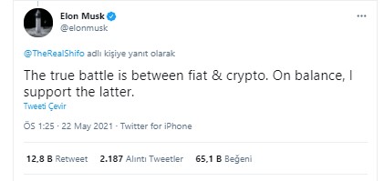 Twitter üzerinden açıklama yapan Musk, "İtibari para ve kripto arasında gerçek bir mücadele var. Ben, ikincisini destekliyorum" dedi.