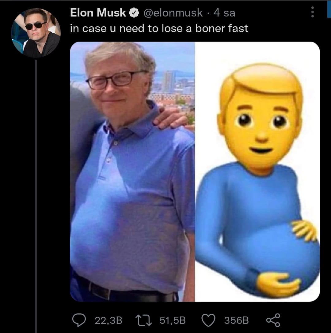Musk dün gece ise metinlerin basına sızmasının ardından, Gates ile ilgili bir caps paylaştı. Görüntüde, göbeği olan bir gates ve hamile kadın emojisi yan yana yer alırken, ‘Heyecanınızı kaybetmek isterseniz…’ ifadeleri yer aldı.