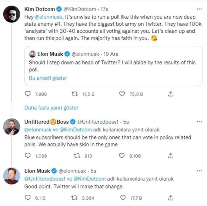 Musk, anket sonucuna ilişkin henüz bir açıklama yapmazken, Twitter'da bir kullanıcının "Uygulamayla ilgili anketlerde sadece mavi tikli aboneler oy kullanmalı" önerisine ''O uygulama değişecek'' yanıtını verdi.