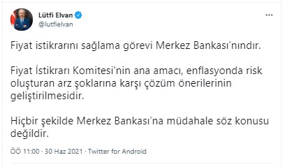 Elvan twitter hesabından yaptığı açıklamada, "Fiyat istikrarını sağlama görevi Merkez Bankası’nındır. Fiyat İstikrarı Komitesi'nin ana amacı, enflasyonda risk oluşturan arz şoklarına karşı çözüm önerilerinin geliştirilmesidir. Hiçbir şekilde Merkez Bankası’na müdahale söz konusu değildir." şeklinde görüş belirtti.