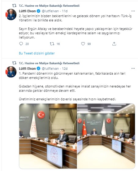 Hazine ve Maliye Bakanı Lütfi Elvan, yeni tip korona virüs (Kovid-19) salgınının görünmeyen kahramanlarının, fabrikalarda alın teri döken emekçiler olduğunu belirterek, "İşçilerimizin bizden beklentilerini ve gelecek dönem yol haritasını Türk-İş yönetimiyle birlikte ele aldık." ifadelerini kullandı.