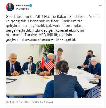 Hazine ve Maliye Bakanı Lütfi Elvan, G20 kapsamında ABD Hazine Bakanı Janet L. Yellen ile görüştü.