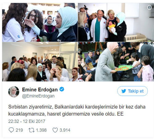 Cumhurbaşkanı Tayyip Erdoğan’ın eşi Emine Erdoğan, yakın zamanda azçtığı resmi Twitter hesabından ilk mesajlarını Sırbistan ziyaretinden verdi.