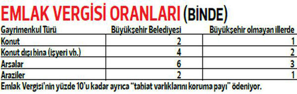 Emlak Vergisi’nin rayiç değeri, (konut ve işyerleri için) arsa değeri ve bina değerinin toplamından oluşuyor. Emlak Vergisi de, bu rayiç değere (tablodaki) vergi oranları uygulanarak hesaplanıyor.