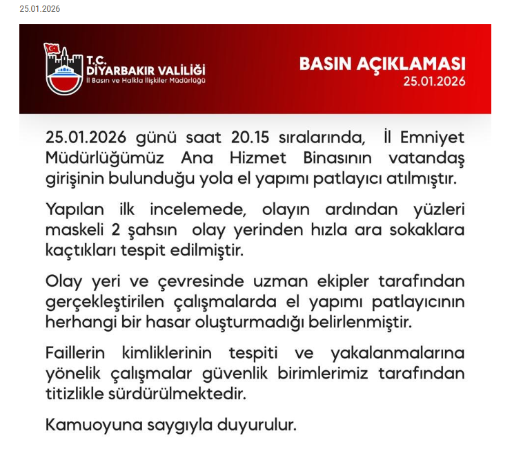 "Olay yeri ve çevresinde uzman ekipler tarafından gerçekleştirilen çalışmalarda el yapımı patlayıcının herhangi bir hasar oluşturmadığı belirlenmiştir. Faillerin kimliklerinin tespiti ve yakalanmalarına yönelik çalışmalar güvenlik birimlerimiz tarafından titizlikle sürdürülmektedir."