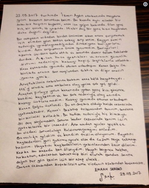 22.09. 2017 tarihinde İzmir- Aydın otobanında meydana gelen kazanın sorumlusu benim. Bu kazada aynı aileden bir baba- kız hayatını kaybetti, anne ise yoğun bakımda. Ölen genç kız, bir çocuk, 16 yaşında. Hiçbir şeyin bir genç kızın hayatından daha değerli değildir. Bir rampanın ardından birden önümüze çıkan araca çarpmamak için elimden gelen bütün çabayı sarf ettim, kaygan zemin nedeniyle yavaşlayamadığımdan direksiyonu bariyerlere vurdum.