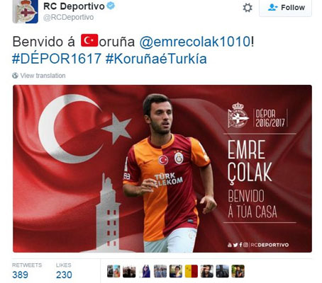 Deportivo, Galatasaraylı Emre Çolak'ı transfer ettiğini resmen açıkladı.