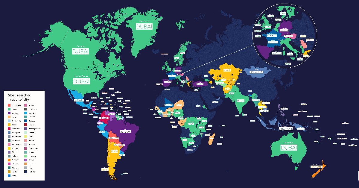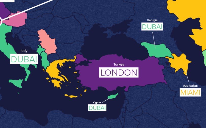 Göçmenlere yönelik bir finansal hizmet sağlayıcısı olan Remitly isimli şirket 164 ülke inceledi, böylece her ülkede en çok aranan yerleşmek üzere gidilmek istenen şehirleri belirledi. Sözcü'de yer alan habere göre, oluşturulan haritada ülke adları, bölge sakinlerinin en çok aradıkları yer değiştirme noktalarıyla değiştirildi.