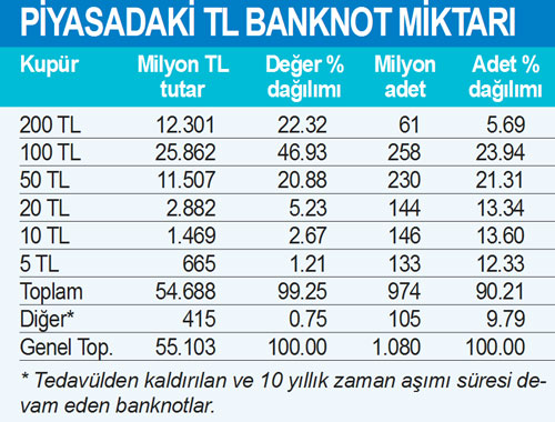 Son 6 yılda bastırılan banknot miktarı ise adet olarak 6.1 milyar adet, değer olarak 225.1 milyar TL. Anlaşıldığı kadarı ile bizim kâğıt paralar yılda bir eskiyor ve yenileniyor.