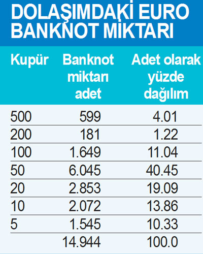 Anlaşıldığı kadarı ile euro kullananlar en çok 50 euro’luk banknot ile işlem yapıyor. Euro banknotların kupür dağılımı bizim TL banknotların dağılımı ile benzer durumda.