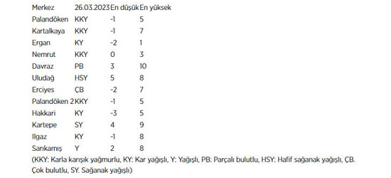 Bazı kayak merkezlerinde en düşük ve en yüksek hava sıcaklık tahminleri ise şöyle: