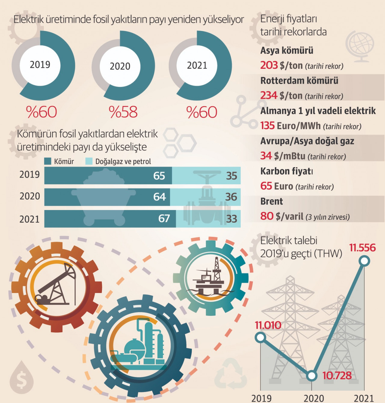 Dünya genelinde ekonomilerin yeniden açılmasıyla gelen güçlü talep ve soğuk kış aylarının yaklaşması, kömürden doğalgaza petrolden elektriğe tüm enerji fiyatlarını tarihi rekor düzeylere yükseltmeye devam ediyor.