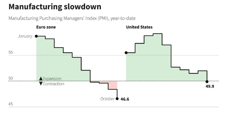 Reuters, Euro bölgesindeki imalat faaliyetinin bu ay Mayıs 2020'den bu yana en düşük seviyesine ulaştığını ve bunun Avrupa'nın resesyona girdiğini gösterdiğini söyledi.