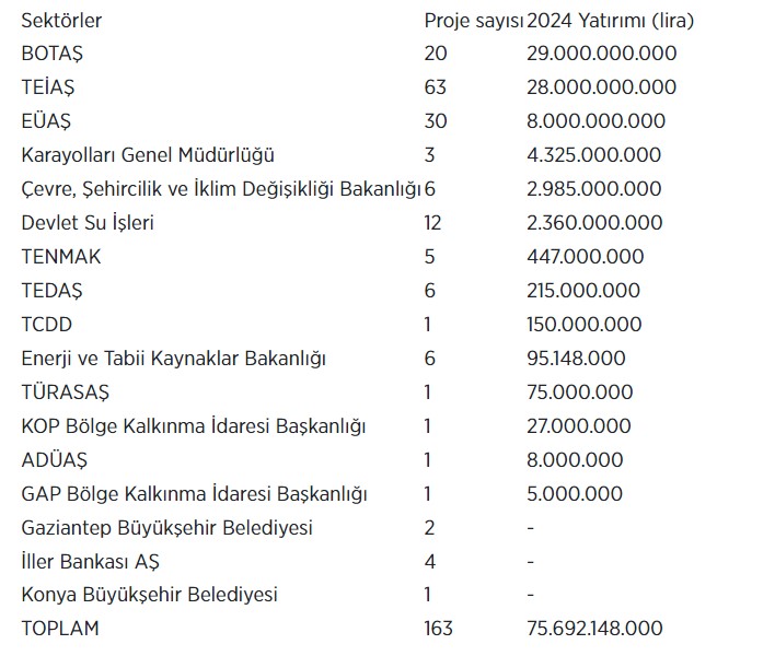 Bu yıl enerji sektöründe 163 proje için kaynak ayrıldı. Sektörde planlanan yatırımların kuruluşlara göre dağılımına bakıldığında 63 projeyle TEİAŞ başı çekerken, bu kurumu 30 projeyle EÜAŞ ve 20 projeyle BOTAŞ izledi.