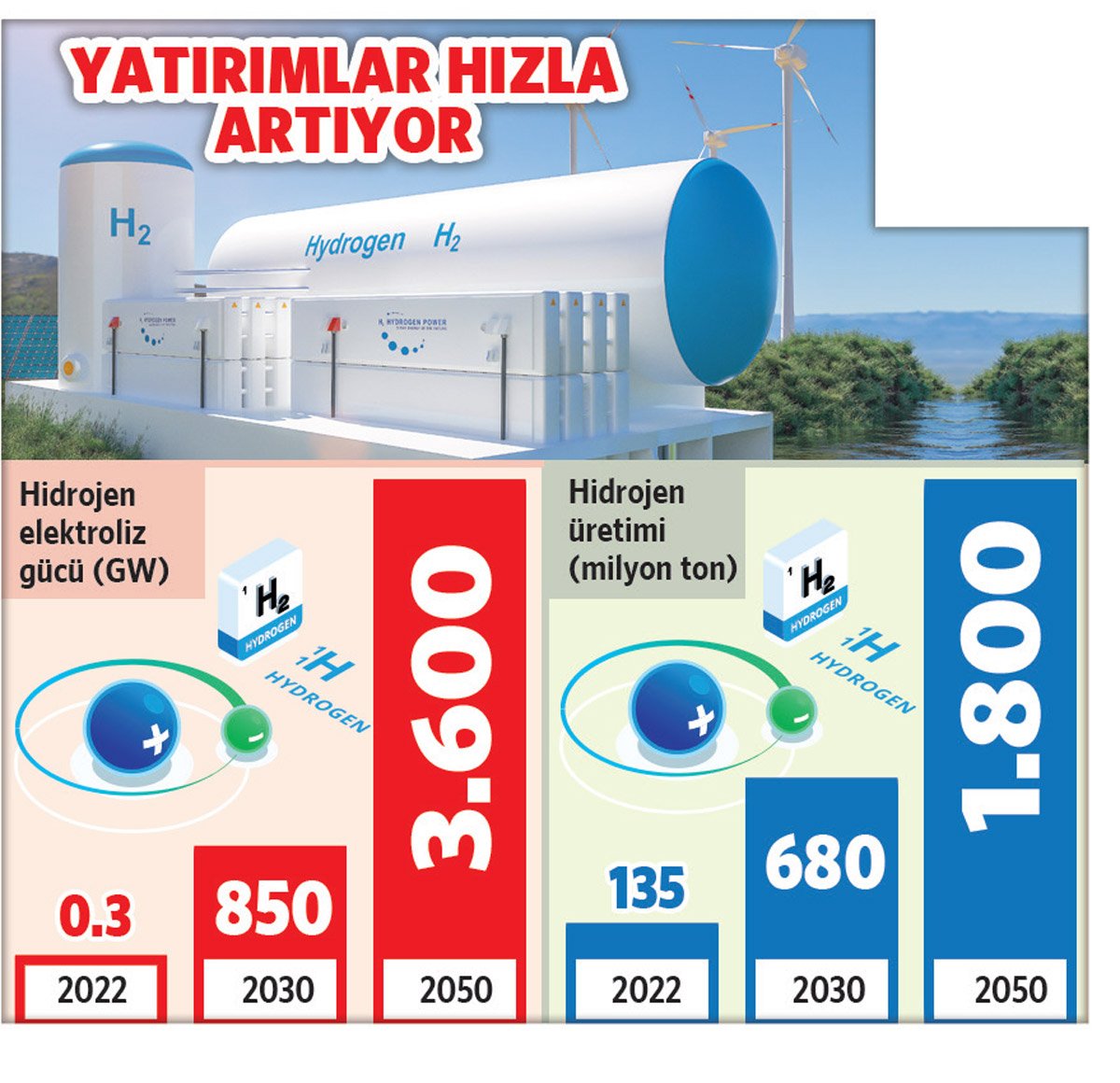 2050 yılında dünyada tüketilen enerjinin yüzde en az 12'sinin hidrojenden karşılanacağı hesaplanırken, en fazla yatırımı Avrupa ülkeleri yapıyor. Hidrojenin elektroliz işlemiyle ortaya çıkarılması için yüksek elektrik tüketimi gerekiyor ve bu kaynağın rüzgar ve güneş enerjilerinden karşılanmasıyla temiz üretim gerçekleştiriliyor.