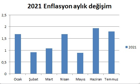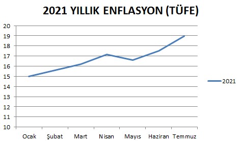 TÜFE'de (2003=100) 2021 yılı Temmuz ayında bir önceki aya göre %1,80, bir önceki yılın Aralık ayına göre %10,41, bir önceki yılın aynı ayına göre %18,95 ve on iki aylık ortalamalara göre %15,15 artış gerçekleşti.