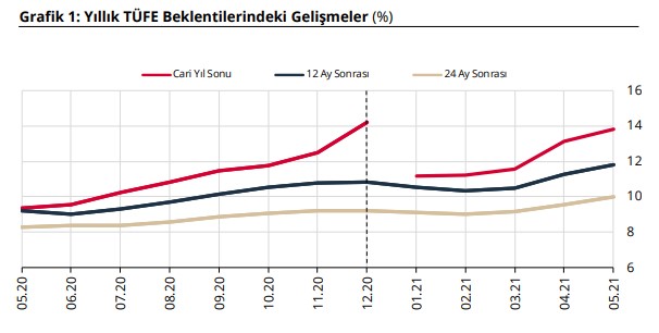 "Cari yıl sonu tüketici enflasyonu (TÜFE) beklentisi bir önceki anket döneminde yüzde 13,12 iken, bu anket döneminde yüzde 13,81 olmuştur. 12 ay sonrası TÜFE beklentisi bir önceki anket döneminde yüzde 11,26 iken, bu anket döneminde yüzde 11,81 olmuştur. 24 ay sonrası TÜFE beklentisi ise aynı anket dönemlerinde sırasıyla yüzde 9,55 ve yüzde 9,99 olarak gerçekleşmiştir.