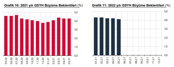 GSYH 2021 yılı büyüme beklentisi bir önceki anket döneminde ve bu anket döneminde yüzde 4,3 olarak gerçekleşmiştir. GSYH 2022 yılı büyüme beklentisi ise bir önceki anket döneminde yüzde 4,2 iken, bu anket döneminde yüzde 4.1 olarak gerçekleşmiştir."