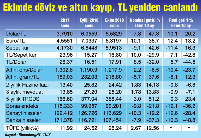 -Ağustos sonuna kadar döviz ve altın yüksek kazançlar sağlıyor, buna karşılık TL yatırım enstrümanları kaybettiriyordu. Eylül ayı geçiş dönemi oldu. Ekim ayı ile birlikte yeni tablo ortaya çıktı. Artık döviz ve altın kaybettiriyor, TL yatırım araçları ise kazandırmaya başladı. Bunun bir tablosu bitişikte yer alıyor.