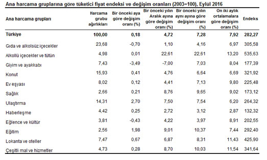 TÜFE’de (2003=100) 2016 yılı Eylül ayında bir önceki aya göre yüzde 0,18, bir önceki yılın Aralık ayına göre yüzde 4,72, bir önceki yılın aynı ayına göre yüzde 7,28 ve on iki aylık ortalamalara göre yüzde 7,92 artış gerçekleşti.