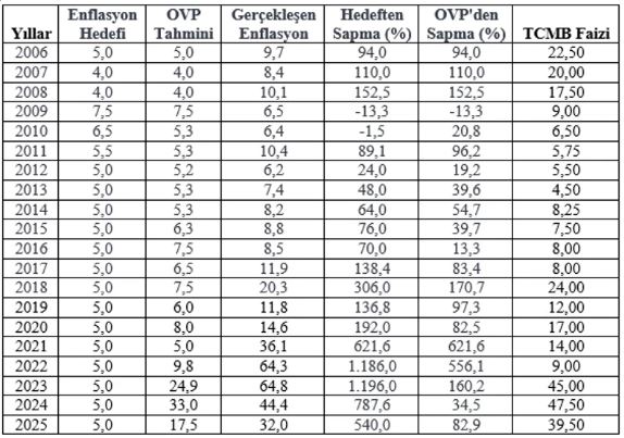 Aşağıdaki tablo enflasyon hedeflerini, OVP enflasyon tahminlerini, gerçekleşen enflasyonu, gerçekleşen enflasyondan yüzde sapmaları ve TCMB politika faizlerini yıllar itibarıyla gösteriyor.