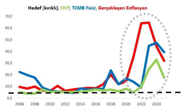 Tablo, enflasyon hedefinden, OVP’lerdeki tahminlerden sapmaların yüksekliğini ve TCMB politika faizinin hedefe veya OVP tahminlerini yakalamak konusunda ne kadar yetersiz kaldığını net bir biçimde ortaya koymakla birlikte, durumu daha iyi gösterebilmek için bu verileri bir grafiğe taşıyalım: