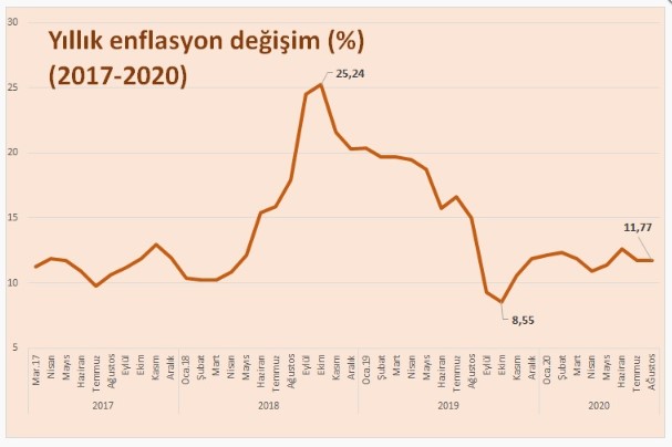 Ağustos ayında enflasyon (TÜFE) bir önceki aya göre yüzde 0,86, bir önceki yılın aralık ayına göre yüzde 7,29, bir önceki yılın aynı ayına göre yüzde 11,77 artış kaydetti. On iki aylık ortalamalara göre ise enflasyon oranı yüzde 11,27 olarak gerçekleşti.