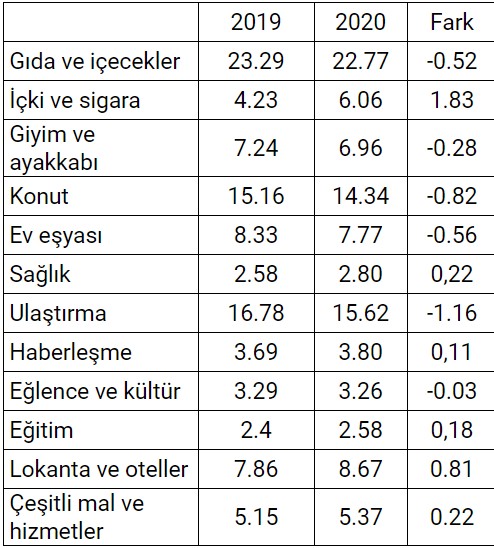 Hükümetin vergi düzenlemeleriyle etkileyebildiği gruplardan içki ve sigaranın ağırlığı ise 1.83 puan artırıldı. Aynı şekilde sağlık, lokanta ve oteller, eğitim ve çeşitli mal ve hizmetler de ağırlığı artırılan diğer gruplar oldu.
