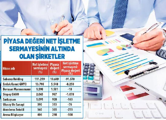 Borsadaki şirketlerden 14’ü net işletme sermayesinin altında işlem görüyor. Bu firmalardan sekizinin piyasa değeri 280 milyon TL’nin üzerinde bulunuyor. Bunlar Sabancı Holding, Emlak Konut GMYO, Borusan Mannesmann, Sinpaş GMYO, Sarkuysan, Ulusoy Un Sanayi, Menderes Tekstil, Arena Bilgisayar.