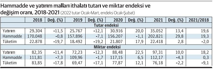 2022 ilk üç ayı itibariyle emtia ve enerji fiyat şokunun etkisi daha belirgin hale geldi. Yatırım malları ithalatı 2022 Ocak-Mart döneminde bir önceki yıl aynı döneme göre yüzde 0,6 oranında azalırken, hammadde ithalatı yüzde 54,4 oranında arttı. Dünya'dan Mehmet Kaya imzasıyla yer alan habere göre artışın büyük kısmının ham petrol, doğalgaz ve diğer hammadde fiyat artışlarından kaynaklandığı belirtiliyor.
