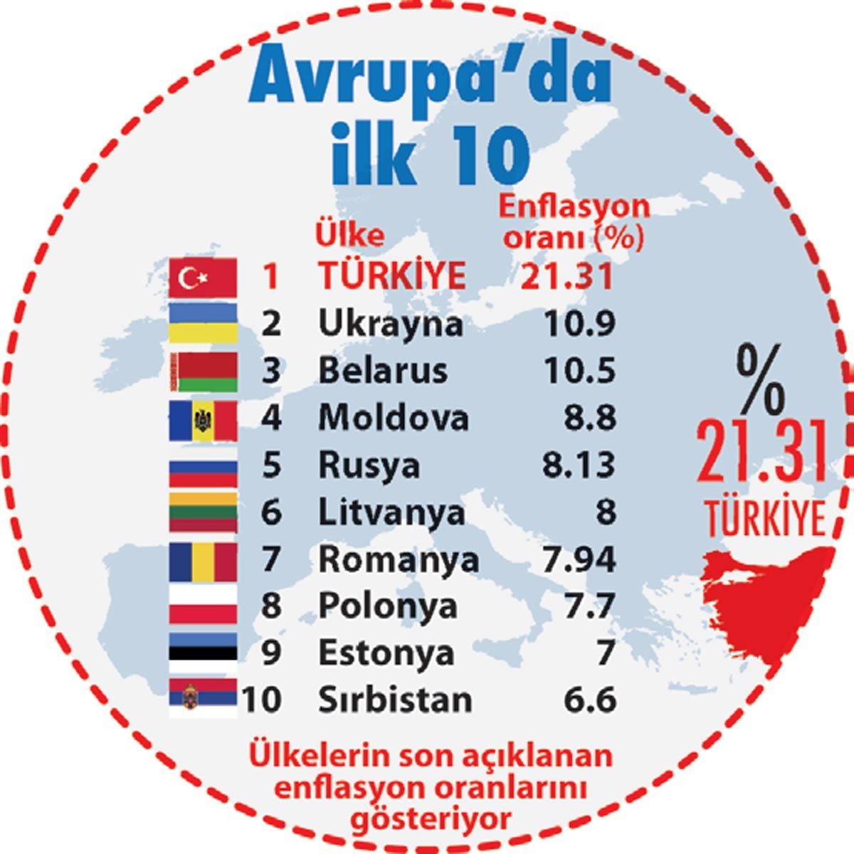 Avrupa ülkeleri arasında en yüksek enflasyon açık ara farkla Türkiye'de yaşanıyor. Onu yüzde 10.9 ile Ukrayna, yüzde 10.5 ile Belarus izliyor. Avrupa genelinde en düşük enflasyon yüzde 0.9 ile Lihtenştayn'da yaşanıyor. (Sözcü)