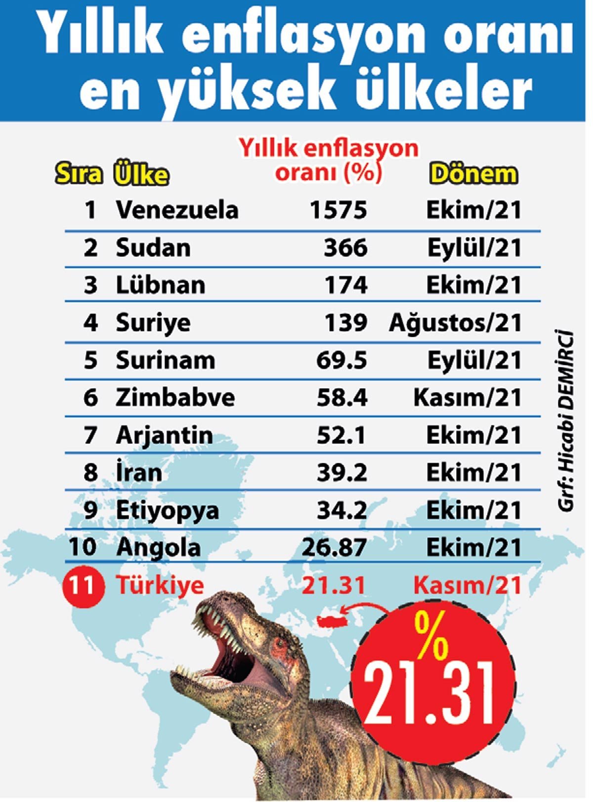 Her ülkenin son açıkladığı veriler karşılaştırıldığında dünyadaki en yüksek enflasyonu yüzde 1575 ile Venezuela yaşıyor. Onu yüzde 366 ile Sudan takip ederken üçüncü sıradaki Lübnan'da enflasyon yüzde 174 oranında. Suriye'de tüketici fiyatlarındaki artış yüzde 139 düzeyinde. Bu oran Surinam'da yüzde 69.5; Zimbabve'de yüzde 58.4; Arjantin'de yüzde 52.1; İran'da yüzde 39.2; Etiyopya'da yüzde 34.2 ve Angola'da yüzde 26.87 seviyesinde. Türkiye ise işte bu ligde, 11'inci sırada yer alıyor.