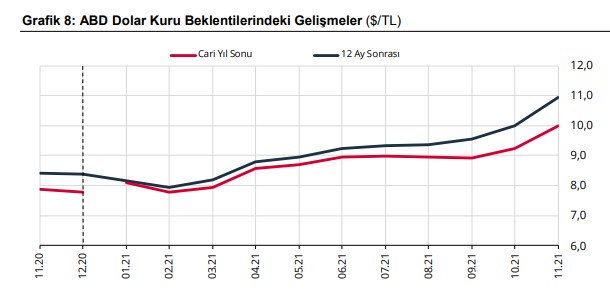 12 ay sonrası döviz kuru beklentisi ise bir önceki anket döneminde 10,01 TL iken, bu anket döneminde 10,93 TL'ye çıktı.