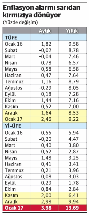 Gidişata bakar mısınız! Son iki ayda, yani aralık ve ocak aylarında TÜ- FE toplamda yüzde 4.14 artış göstermiş. Yİ-ÜFE'deki artış ise yüzde 7.08'i bulmuş. Dikkat; yalnızca iki ayda oluyor bu artışlar.
