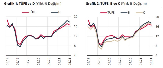 Tüketici fiyatları Mayıs ayında yüzde 0,89 oranında artmış, yıllık enflasyon 0,55 puan düşüşle yüzde 16,59 olmuştur. Yıllık enflasyon enerji ve temel mal gruplarında gerilerken, gıda grubunda yatay seyretmiş, hizmet grubunda ise yükselmiştir. Bu dönemde enerji fiyatları, Türk lirası cinsinden petrol fiyatlarındaki gelişmelere ek olarak eşel mobil sisteminin uyarlanması ve tavan fiyat uygulamasının kaldırılmasıyla yükselmiş; ancak yüksek baz nedeniyle grup yıllık enflasyonu gerilemiştir. Mayıs ayındaki kapanmaya bağlı olarak faaliyetin kesintiye uğradığı bazı kalemlerde fiyat artışları düşük seyretmiştir. Bu kapsamda, döviz kuru gelişmelerine karşın, giyim sektörü başta olmak üzere temel mal enflasyonu ılımlı bir seyir göstermiştir. Hizmet grubu enflasyonunun seyrinde kapasite kısıtlarına bağlı olarak yüksek fiyat artışı sergileyen ulaştırma hizmetleri etkili olmuştur. Bu dönemde emtia fiyatlarındaki yükseliş genele yayılarak hızlanmıştır. Türk lirası cinsinden ithalat fiyatlarındaki gelişmeler ile bazı ürünlerde süregelen arz kısıtlarının etkisiyle üretici fiyatlarındaki hızlı artış eğilimi devam etmiş ve maliyet baskıları etkisini sürdürmüştür. Bu gelişmelerle, B ve C göstergelerinin yıllık enflasyonları ve eğilimleri bir miktar gerilemekle birlikte yüksek seviyelerini korumuştur.