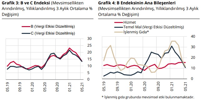 Mevsimsellikten arındırılmış verilerle, üç aylık ortalamalara göre B ve C göstergelerinin eğilimi gerilemiştir. Bu dönemde, enflasyon eğilimi temel mal ve işlenmiş gıda gruplarında azalışını sürdürürken, hizmet grubunda yataya yakın seyretmiştir.