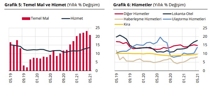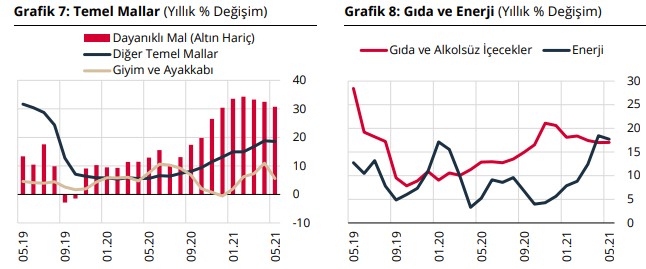 Giyim ve ayakkabı grubu fiyatlarında bir süredir devam eden yüksek artış eğilimi, salgın kaynaklı kısıtlamalarla önemli ölçüde yavaşlamış, grup yıllık enflasyonu 5,40 puan azalarak yüzde 5,56 seviyesine gerilemiştir. Dayanıklı mal fiyatları bu dönemde artışını sürdürürken (aylık yüzde 0,91), otomobil ve mobilya gruplarında döviz kuru ve emtia fiyatlarındaki gelişmelerin etkileri izlenmiş, öte yandan elektrikli ve elektriksiz aletlerde gözlenen aylık fiyat düşüşü (yüzde -0,35) grup enflasyonunu sınırlamıştır. Diğer temel mallar grubunda fiyatlar sınırlı bir artış göstermiş (aylık yüzde 0,21), grup yıllık enflasyonu yataya yakın seyrederek yüzde 18,59 olmuştur.