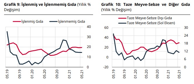0,06 puan azalışla yüzde 14,61’e gerilerken, işlenmiş gıda grubunda 0,13 puan artışla yüzde 19,49’a yükselmiştir. İşlenmemiş gıda grubunda mevsimsellikten arındırılmış veriler, sebze grubu kaynaklı olarak taze meyve-sebze fiyatlarında artışa işaret etmiştir. Bu dönemde, diğer işlenmemiş gıda grubunda kırmızı et fiyatlarındaki yükseliş eğiliminin sürdüğü gözlenmiştir. Mayıs ayında işlenmiş gıda fiyatları aylık bazda yüzde 0,87 oranında artmış bu gelişmede ekmek ve tahıllar ile alkolsüz içecekler kalemlerindeki yükselişler öne çıkmıştır. Böylelikle, taze meyve-sebze dışı gıda grubu yıllık enflasyonu yüzde 18,61 seviyesine yükselmiştir.