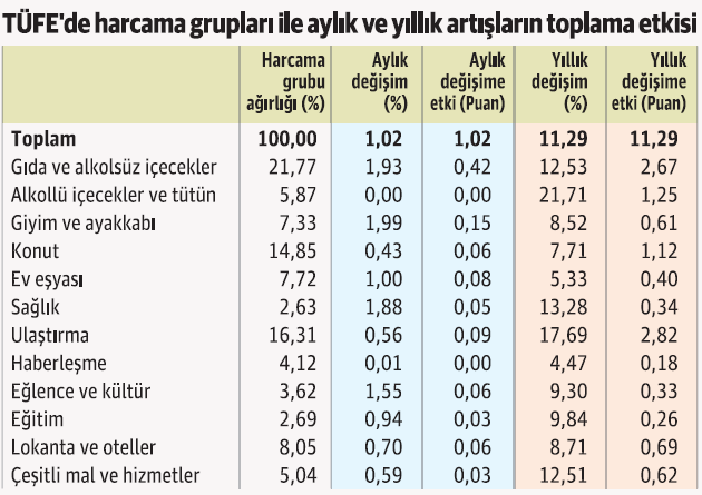Gıdada ise yıllık artış yüzde 12.53 düzeyinde gerçekleşti, bu artıştan da toplama 2.67 puanlık bir yansıma oldu.
