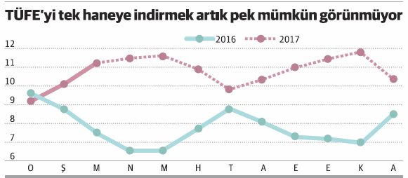 Yıllık TÜFE'de son sekiz buçuk yılın rekorunu kırdık. Ama yeni rekorlar bizi bekliyor; nisan ve mayısta daha yüksek oranlar görebiliriz. Yılı tek hanede tamamlama olanağımız da neredeyse kalmadı. Hele hele Merkez Bankası'nın 2017 tahmini olan yüzde 8'de kalmak, tümüyle mümkün olmaktan çıktı. Şimdilik görünen, yüzde 10.5 dolayında bir yılsonu gerçekleşmesi...